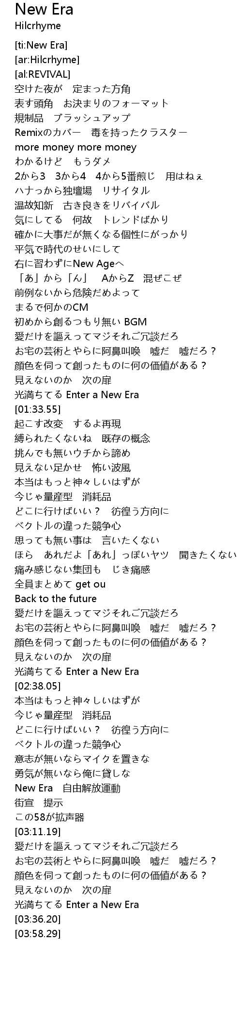 | [00:55.11] | 右に習わずにNew Ageへ |