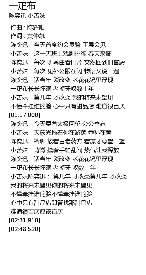 | [02:08.730] | 一疋布长长怀缅 老掉牙 叹数十年 |