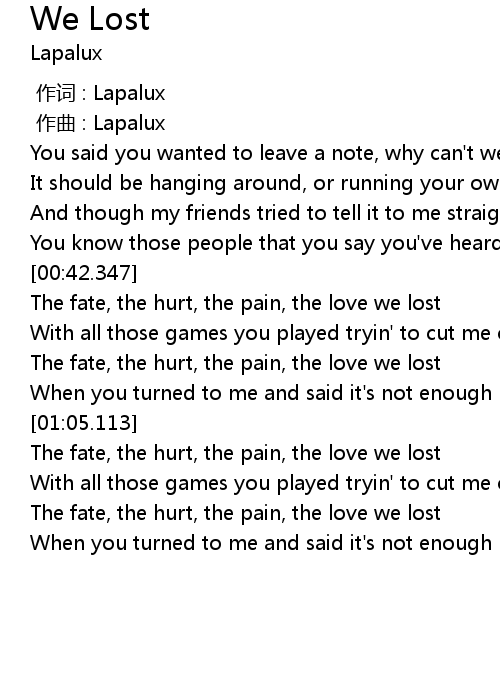 | [01:38.000] | The fate, the hurt, the pain, the love we lost |