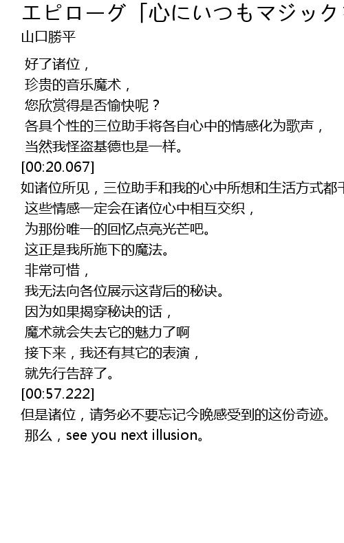 | [00:57.222] | 但是诸位,请务必不要忘记今晚感受到的这份奇迹。 |
