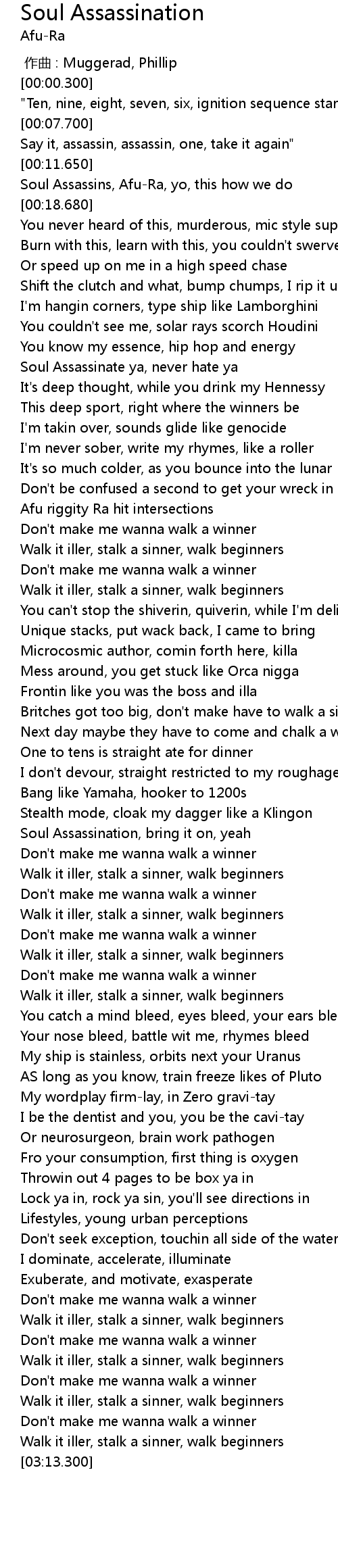 | [00:38.080] | Soul Assassinate ya, never hate ya |