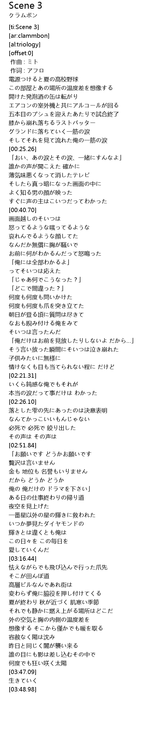 | [03:00.32] | 俺の 俺だけの ドラマを下さい」 |