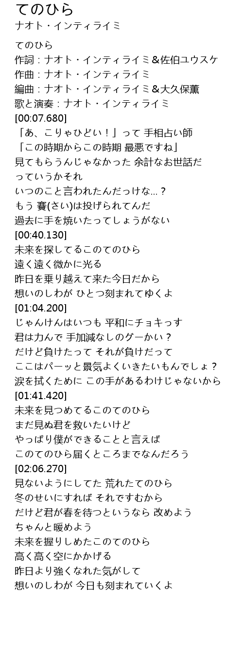 | [00:01.240] | 作詞:ナオト・インティライミ&佐伯ユウスケ |