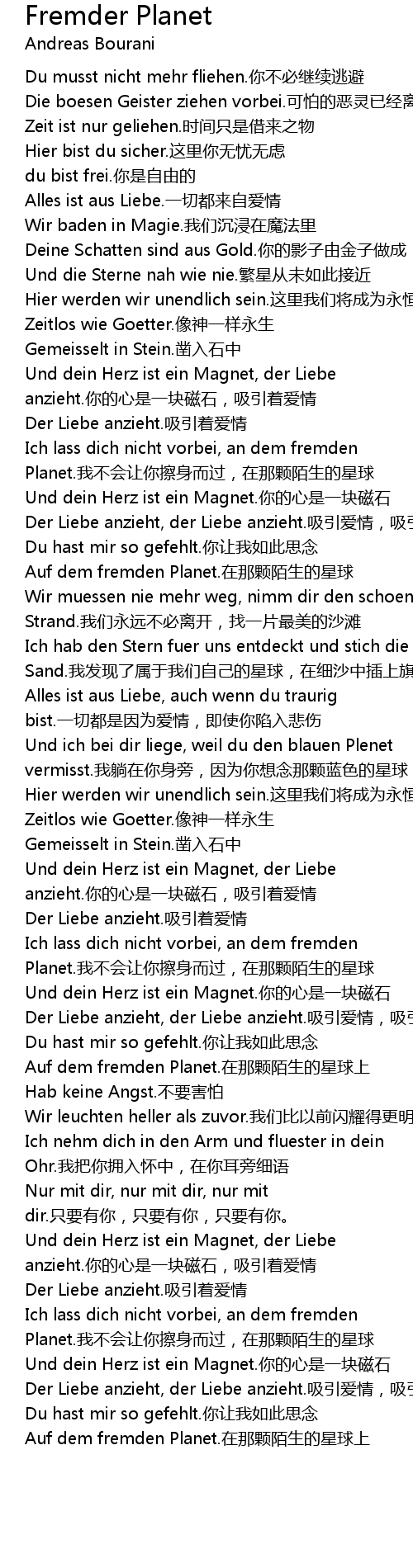 | Ich hab den Stern fuer uns entdeckt und stich die Fahne in den Sand. wǒ fā xiàn le shǔ yú wǒ men zì jǐ de xīng qiú, zài xì shā zhōng chā shang qí zi | |