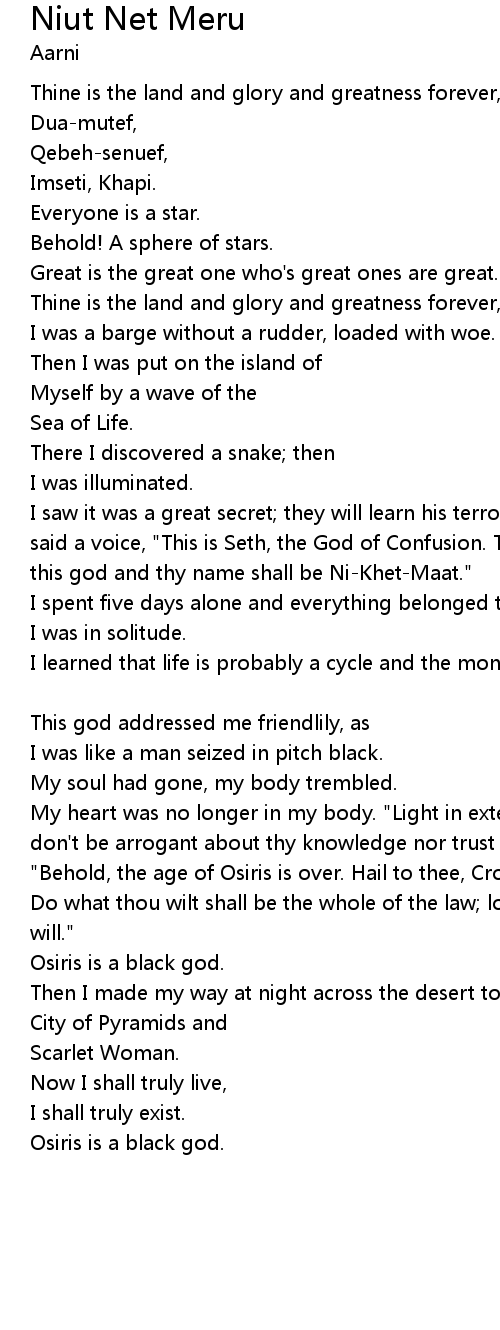 | I saw it was a great secret; they will learn his terror is great. "Behold!", said a voice, "This is Seth, the God of Confusion. Thou art to be a priest of this god and thy name shall be Ni-Khet-Maat." | |