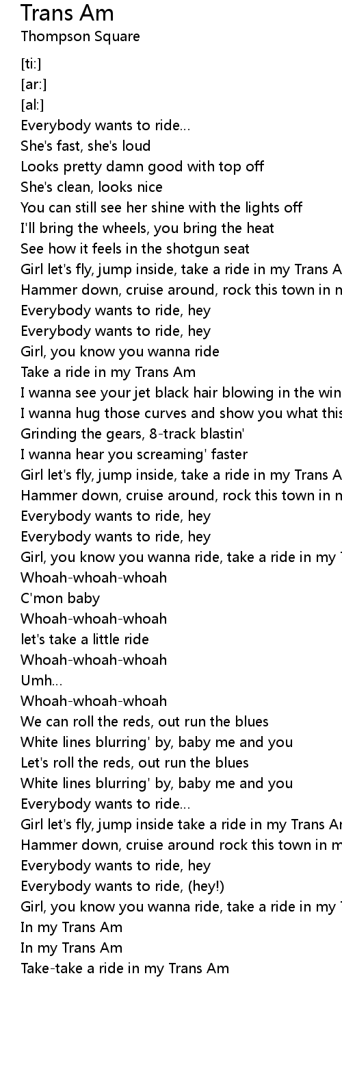 | [00:36.16] | Hammer down, cruise around, rock this town in my Trans Am |