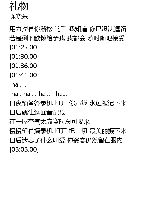 | [02:34.00][01:41.00][00:47.00] | 幸福早拥有过 什么都不必送 给我 |