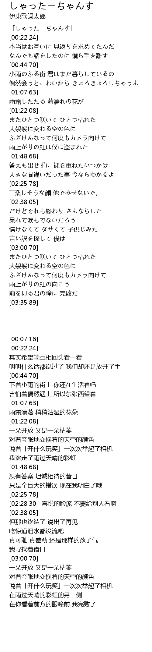 | [00:07.16] | 「しゃったーちゃんす」 |