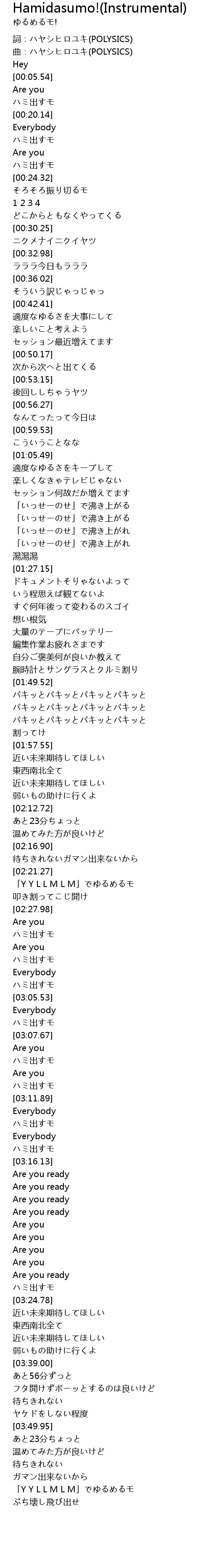 | [00:03.55] | 曲:ハヤシヒロユキ(POLYSICS) |