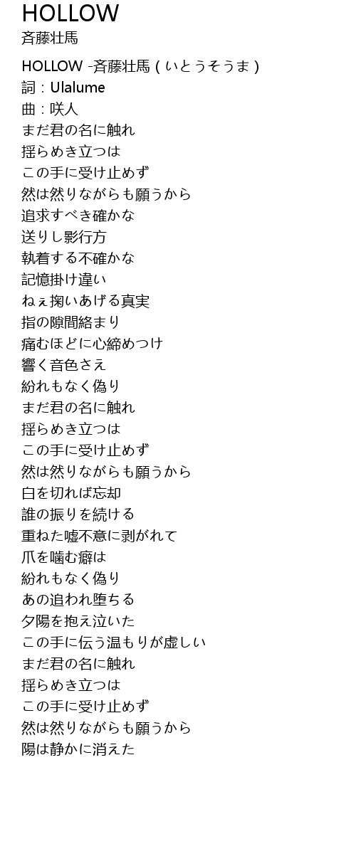 | [00:00.00] | HOLLOW -斉藤壮馬(いとうそうま) |