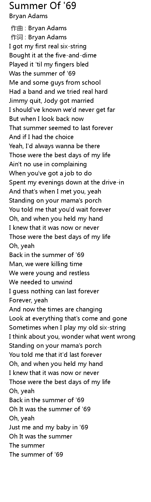 | [00:29.99] | Was the summer of ' 69 |