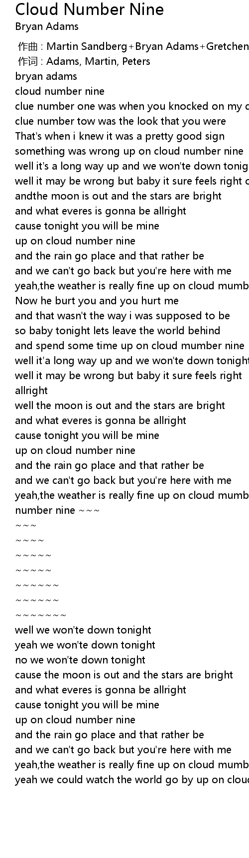 | [03:59.76] | yeah we could watch the world go by up on cloud number nine |