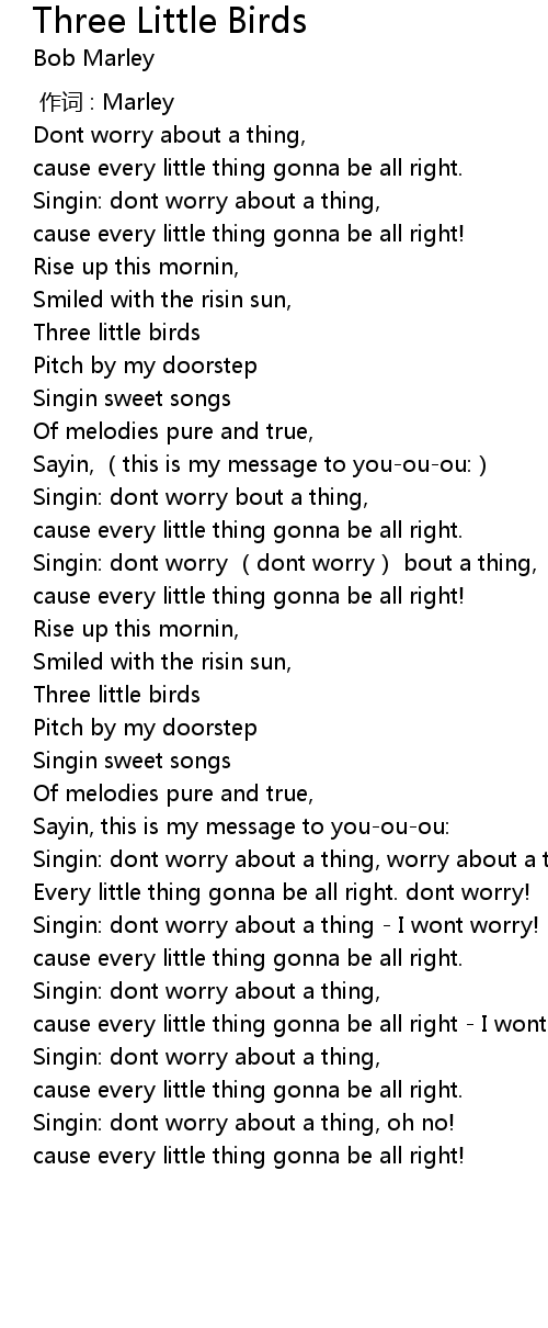 | [01:58.03] | Singin: dont worry about a thing, worry about a thing, oh! |