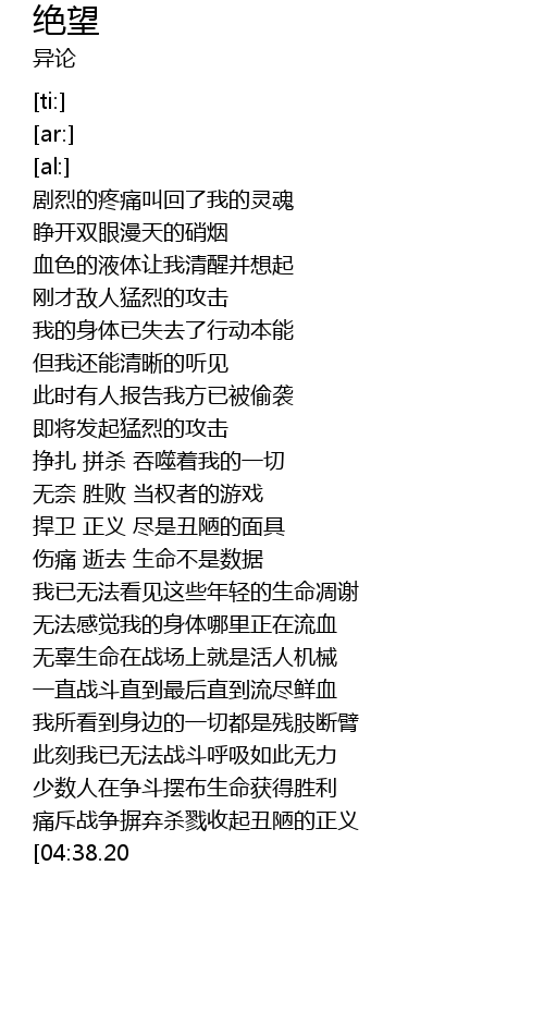 | [04:32.12] | 无辜生命在战场上就是活人机械 |