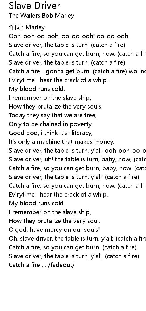 | Slave driver, uh! the table is turn, baby, now catch a fire | |