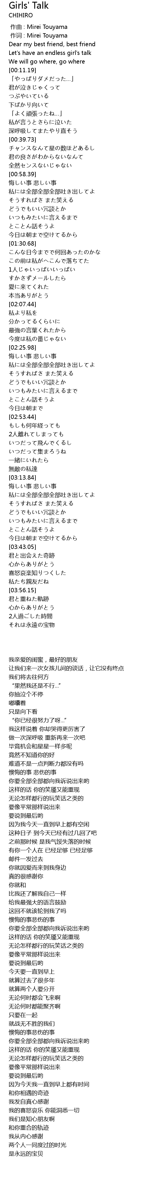 | [00:04.66] | Let' s have an endless girl' s talk |