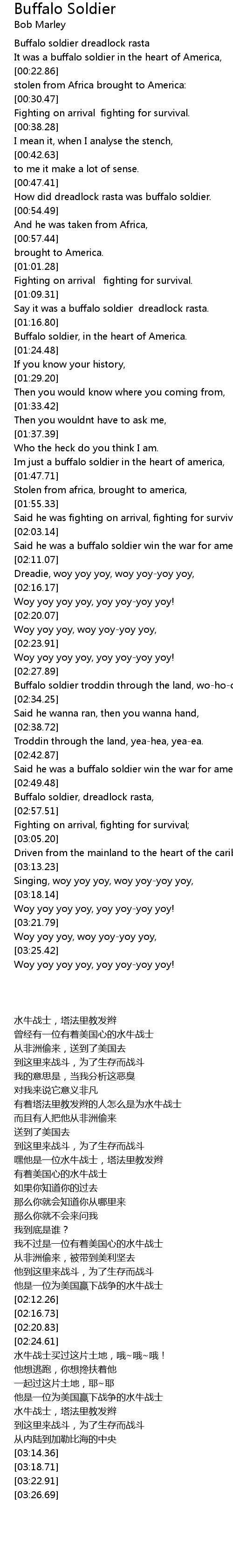 Buffalo soldier troddin through the land, wo-ho-ooh! |