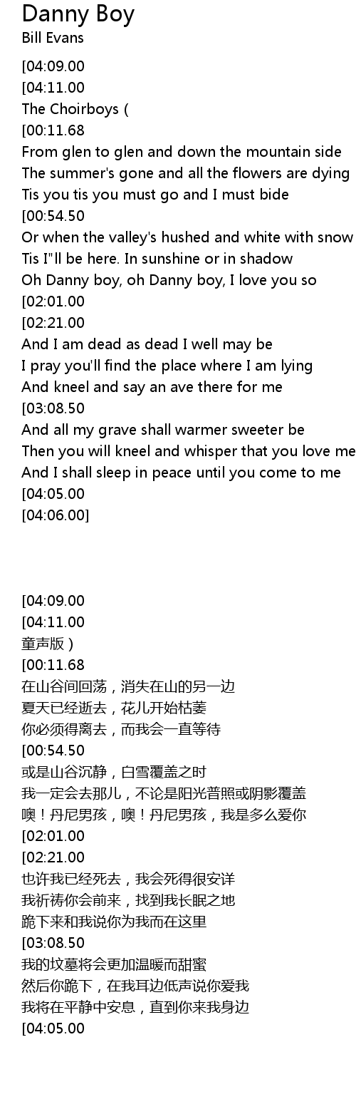 | [01:26.13] | Oh Danny boy, oh Danny boy, I love you so |