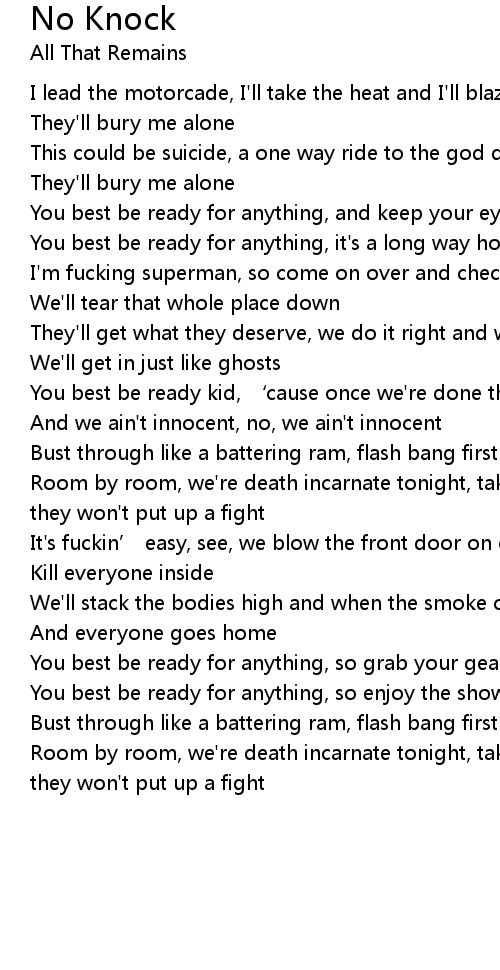 | Room by room, we' re death incarnate tonight, take them while they' re sleeping, they won' t put up a fight | |