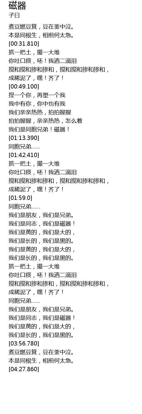 | [03:36.130] | wǒ men shì tóng zhì, wǒ men shì cí qì! |