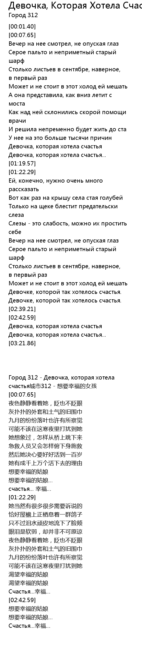 | [00:01.40] | Город 312 - Девочка, которая хотела счастья城市312 - 想要幸福的女孩 |
