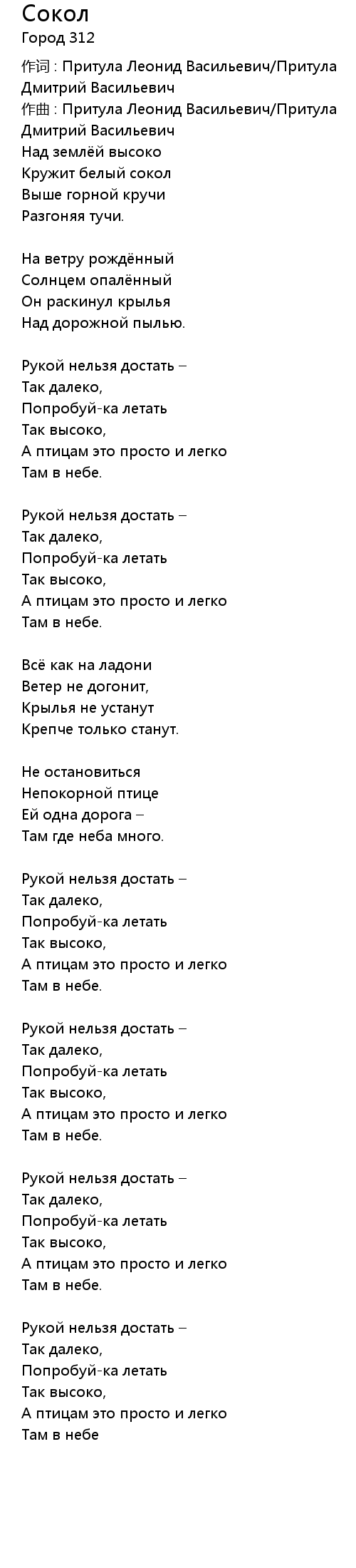 Сокол 歌词