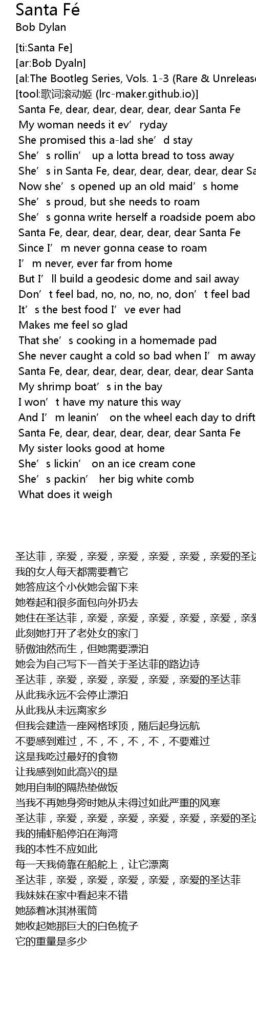 | [00:43.046] | 圣达菲,亲爱,亲爱,亲爱,亲爱,亲爱的圣达菲 |