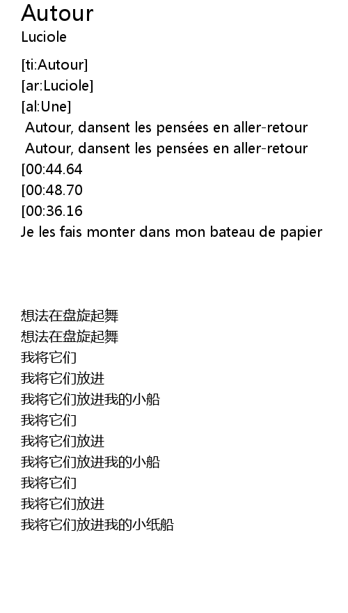 | [00:10.90] | Autour, dansent les pensées en aller-retour |