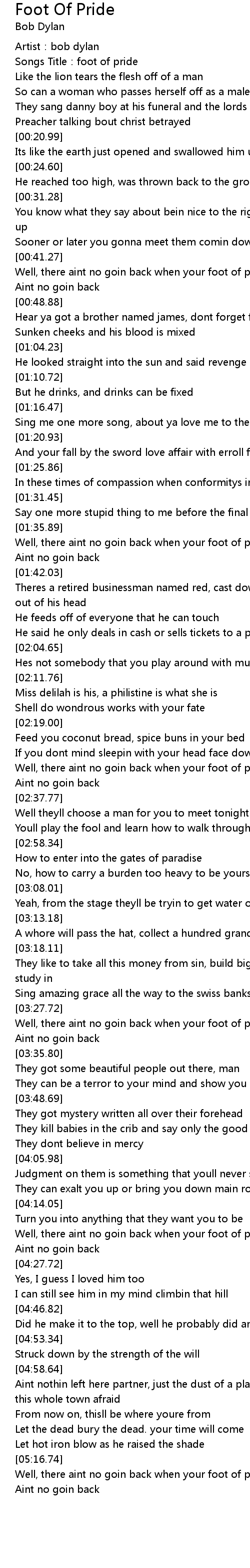 | [05:18.49] | Well, there aint no goin back when your foot of pride come down |
