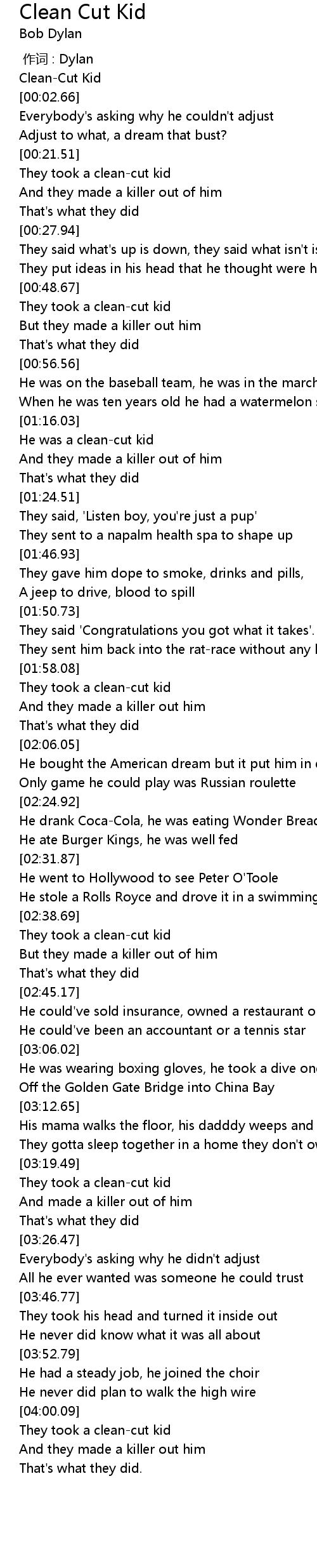 | [00:22.42] | They took a clean-cut kid |