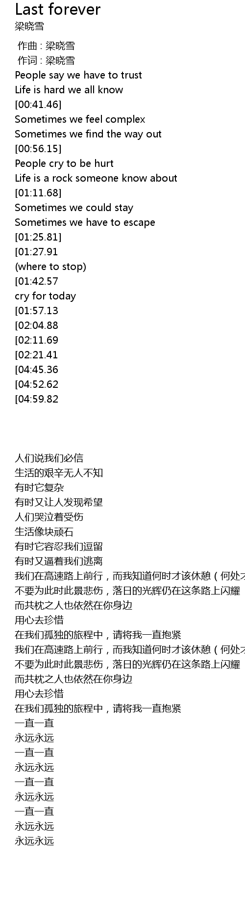 | [05:03.68][04:45.36][04:23.60] | Last forever last forever |