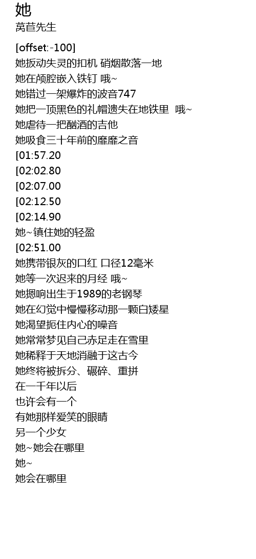 | [00:57.80][02:07.00] | 她将不再年轻 |
