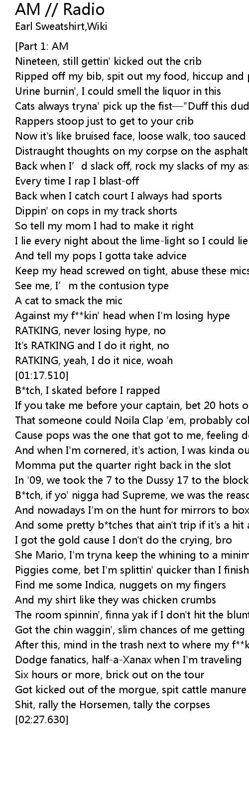 | [02:09.390] | After this, mind in the trash next to where my f**kin' passion went |