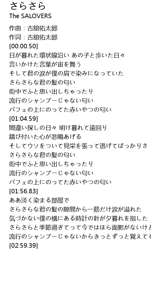 | [02:48.41] | 流行のシャンプーじゃないからきっとずっと覚えてる淡い恋の匂い |
