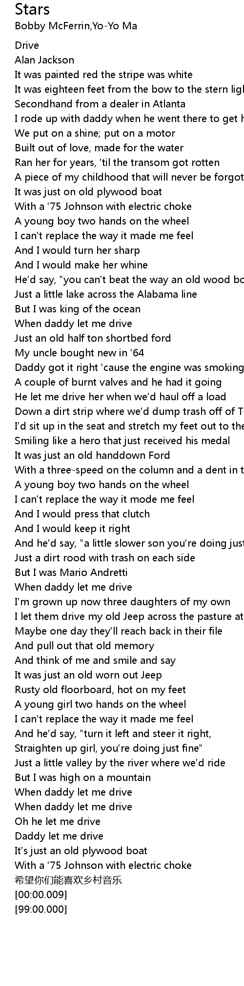 | [01:33.25] | He let me drive her when we′d haul off a load |