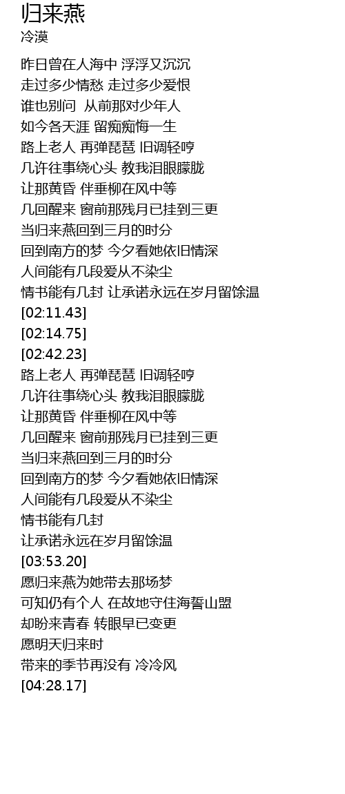| [03:54.33] | 愿归来燕为她带去那场梦 |