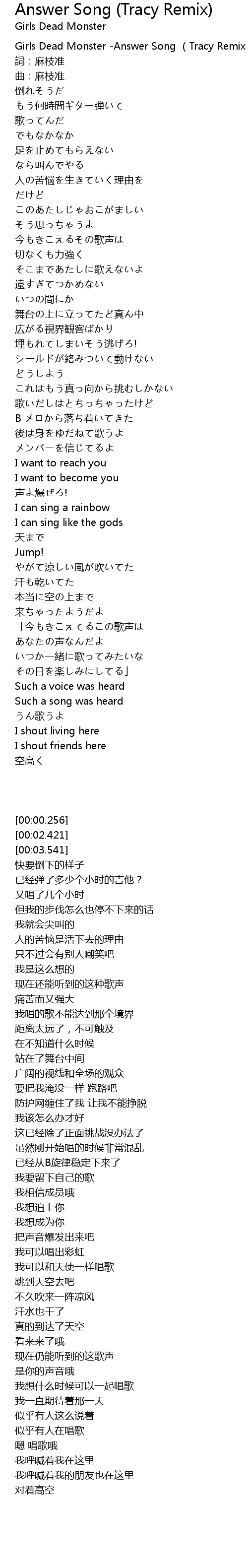 | [00:00.256] | Girls Dead Monster Answer Song Tracy Remix |