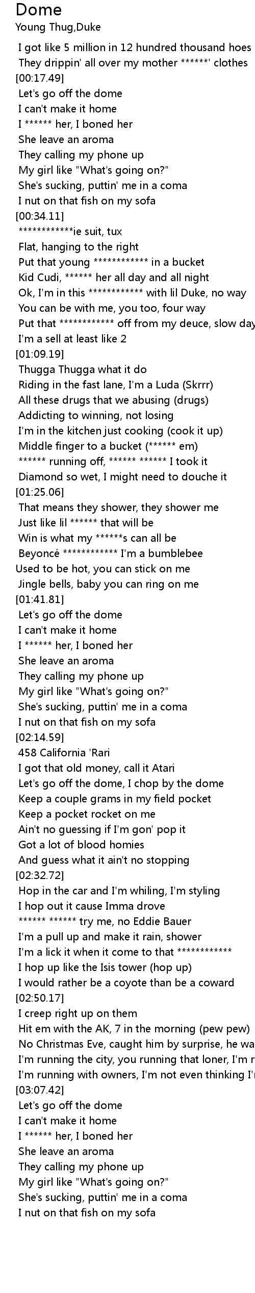 | [01:00.19] | Ok, I'm in this ************ with lil Duke, no way |