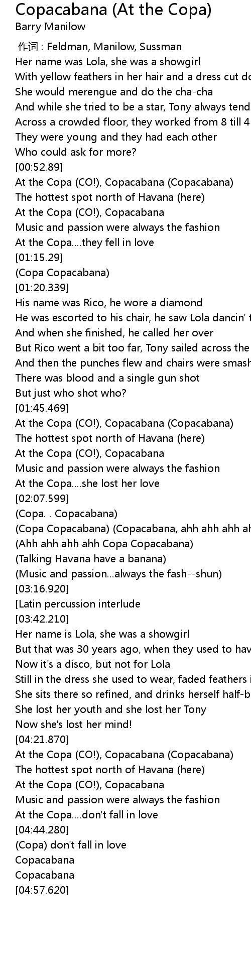 | [00:52.569] | At the Copa (CO!), Copacabana (Copacabana) |