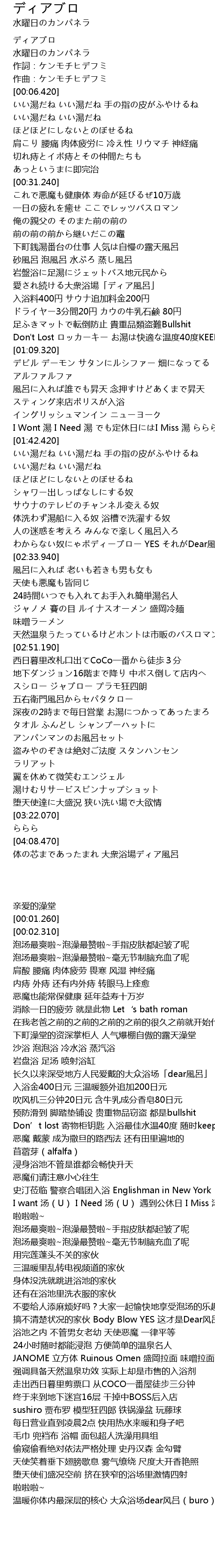 | [00:49.720] | 岩盤浴に足湯にジェットバス地元民から |