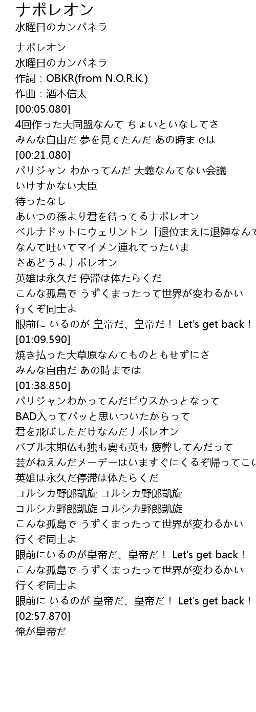 | [00:34.550] | なんて吐いてマイメン連れてったいま さあどうよナポレオン |