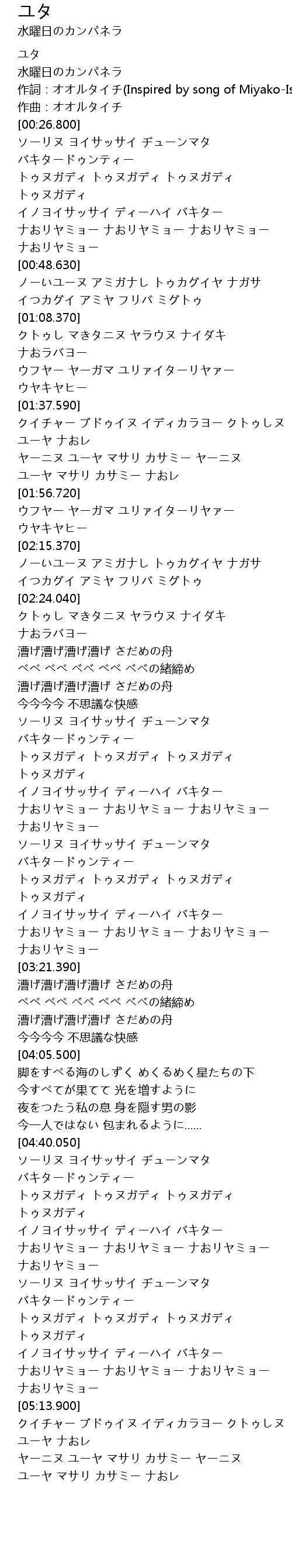 | [01:44.960] | ヤーニヌ ユーヤ マサリ カサミー ヤーニヌ |