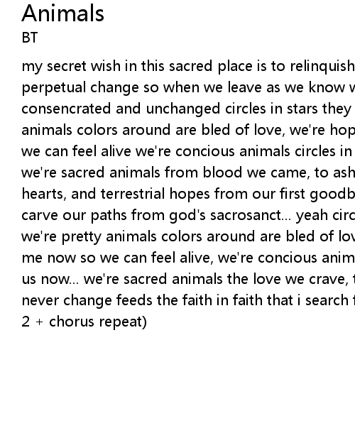 my secret wish in this sacred place is to relinquish needs the great constant is perpetual change so when we leave as we know we will, some of us remains, consencrated and unchanged circles in stars they bind us now, we're pretty animals colors around are bled of love, we're hopefully animals kiss me now so we can feel alive we're concious animals circles in stars they bind us now, we're sacred animals from blood we came, to ash we return again these carbon hearts, and terrestrial hopes from our first goodbye to the last hello, pray we carve our paths from god's sacrosanct... yeah circles in stars they bind us now, we're pretty animals colors around are bled of love, we're hopeful animals kiss me now so we can feel alive, we're concious animals circles in stars they bind us now... we're sacred animals the love we crave, that binds, bends but can never change feeds the faith in faith that i search for in everything... (bridge 2 + chorus repeat) |