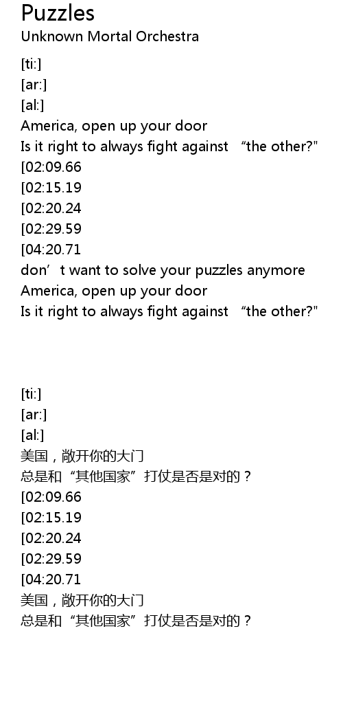 | [04:29.76][04:20.71][04:11.61][04:02.76][03:01.99][02:52.99][02:43.90][02:34.70] | I don’t want to solve your puzzles anymore |