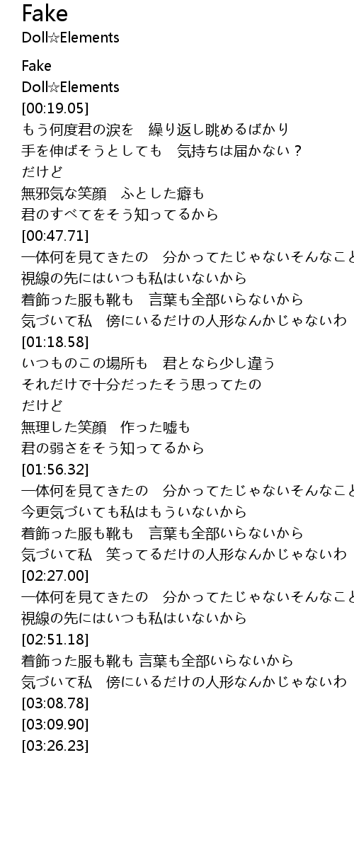 | [02:58.31] | 気づいて私 傍にいるだけの人形なんかじゃないわ |