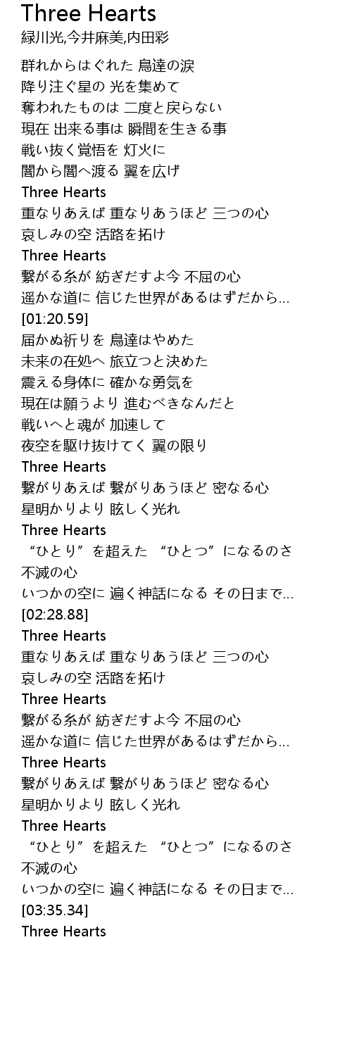 | [00:56.14] | 重なりあえば 重なりあうほど 三つの心 |