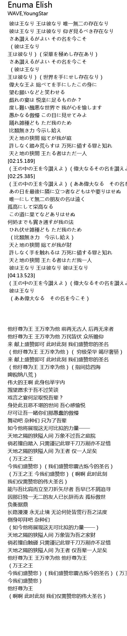 | [02:25.385] | (万王之王 今我们盛赞您)(啊啊 此时此刻 我们仅需赞您的伟大圣名) |