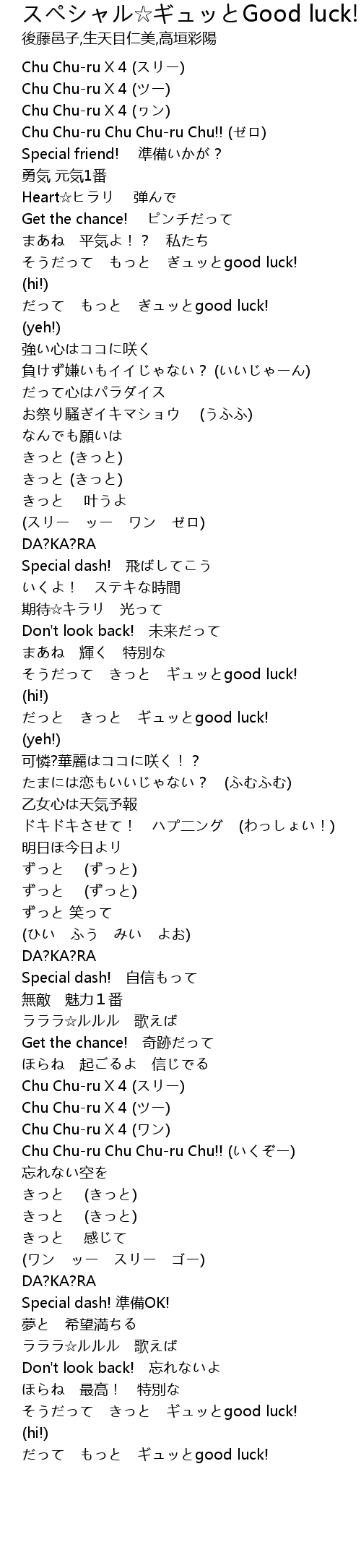 | [00:25.50] | そうだって もっと ぎュッとgood luck! |
