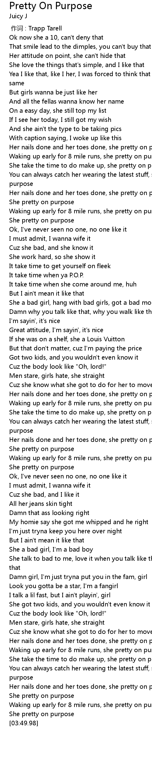 | [03:23.50] | She take the time to do make up, she pretty on purpose |