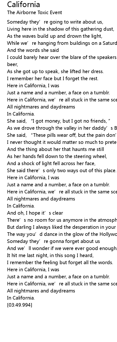 | [02:04.745] | Here in California, we' re all stuck in the same scene, |